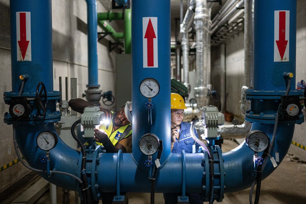 由中建集团承建的埃及新行政首都中央商务区不仅是埃及国家复兴计划的重要工程,也是中埃共建“一带一路”的重点。在项目建设过程中,中埃参建单位共同努力,借鉴中国成熟方案,通过加强公共交通规划、采用节能建筑技术、降低建设资源消耗、提升能源使用效率等一系列措施,打造“绿色项目”,也为埃及的绿色科技创新、绿色产业升级提供借鉴。这是2024年9月18日,机电工程团队在建设现场工作。