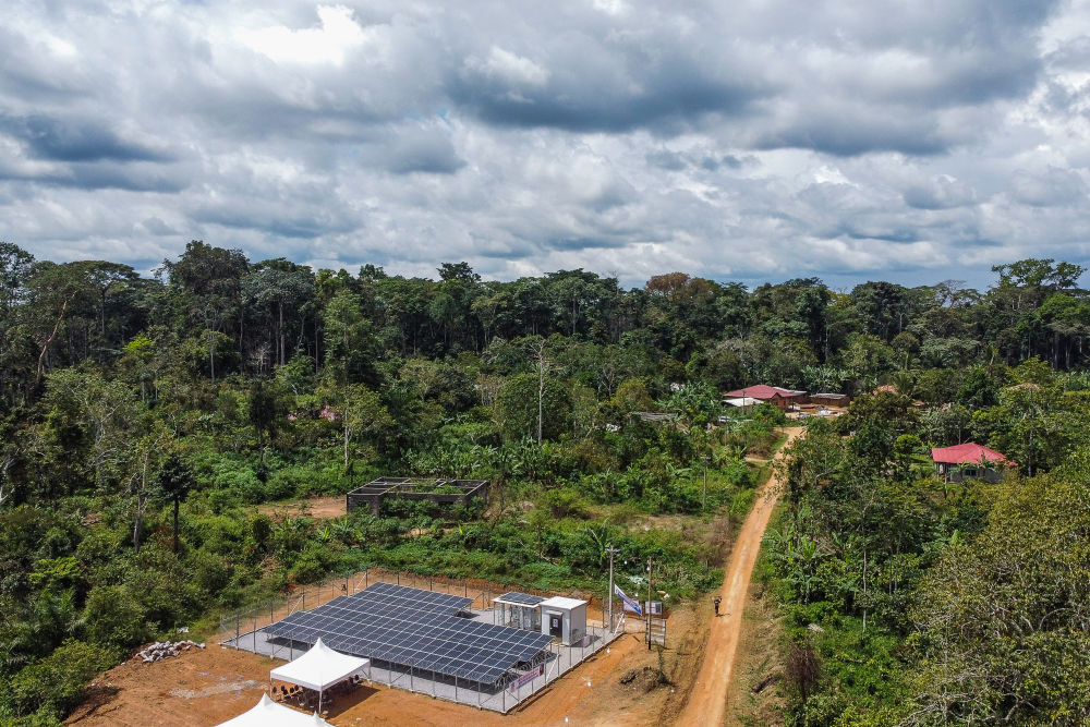 这是2025年10月8日在喀麦隆松明比亚斯村拍摄的太阳能电站(无人机照片)。来自中国的光伏产品质优价廉,深受当地民众欢迎。