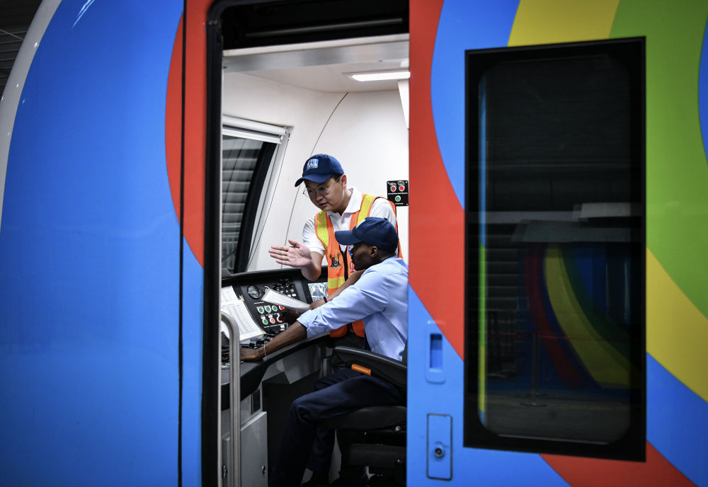 2024年3月3日,在尼日利亚拉各斯,中国师傅王奥飞(后)在轻轨蓝线列车驾驶室指导见习司机阿旺甘斯驾驶技能。拉各斯轻轨蓝线是西非地区首条由中国企业自主设计、建造、施工、运营的电气化城市轨道交通项目,由中国土木尼日利亚有限公司承建。蓝线所采用的全电力列车为通勤者提供了绿色、环保和节能的出行方式,缩短了出行时间,提高了市民生活质量。