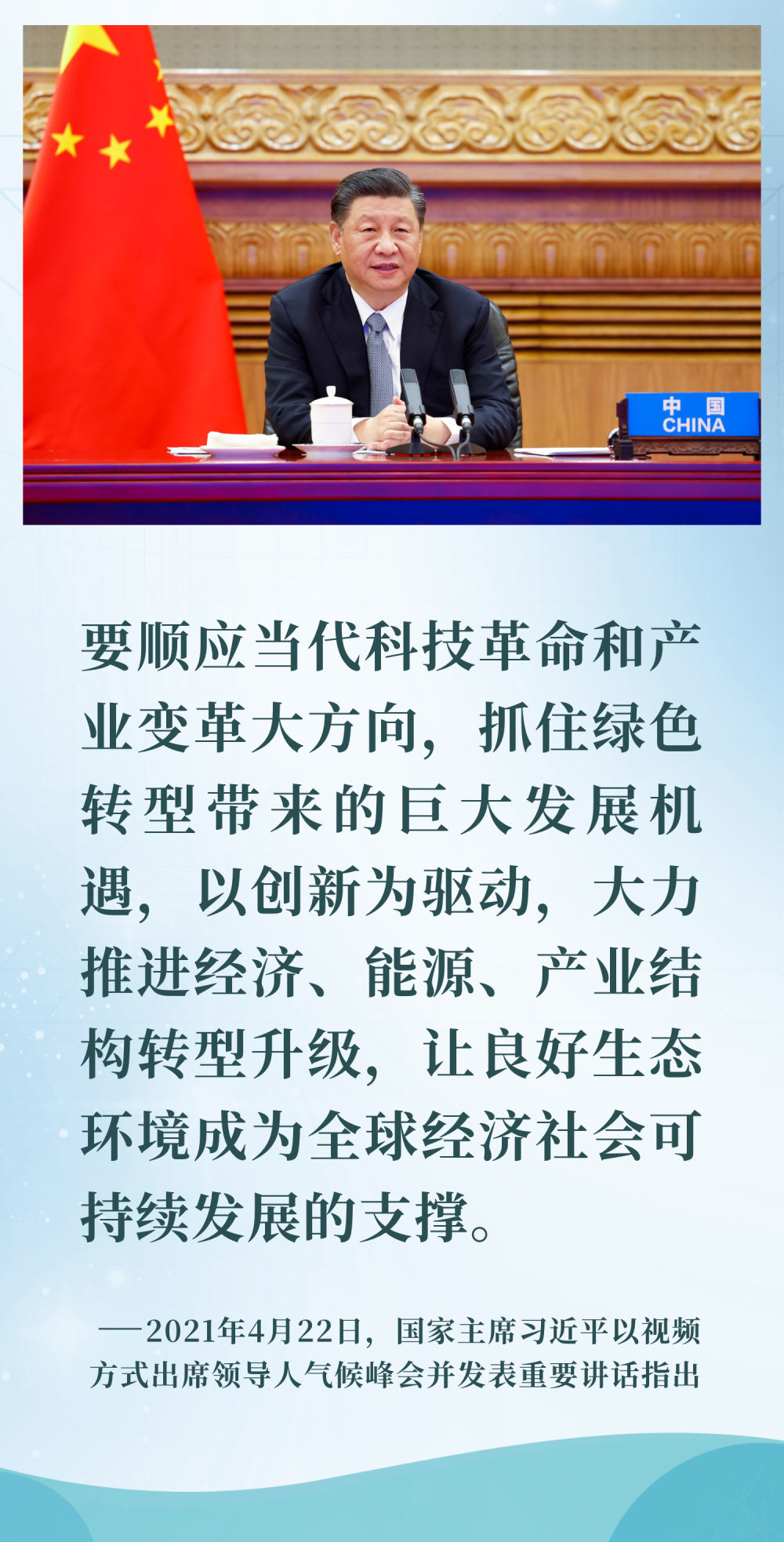 胸怀人类共同的前途命运,习近平主席多次呼吁加强绿色国际合作,共享绿色发展成果。